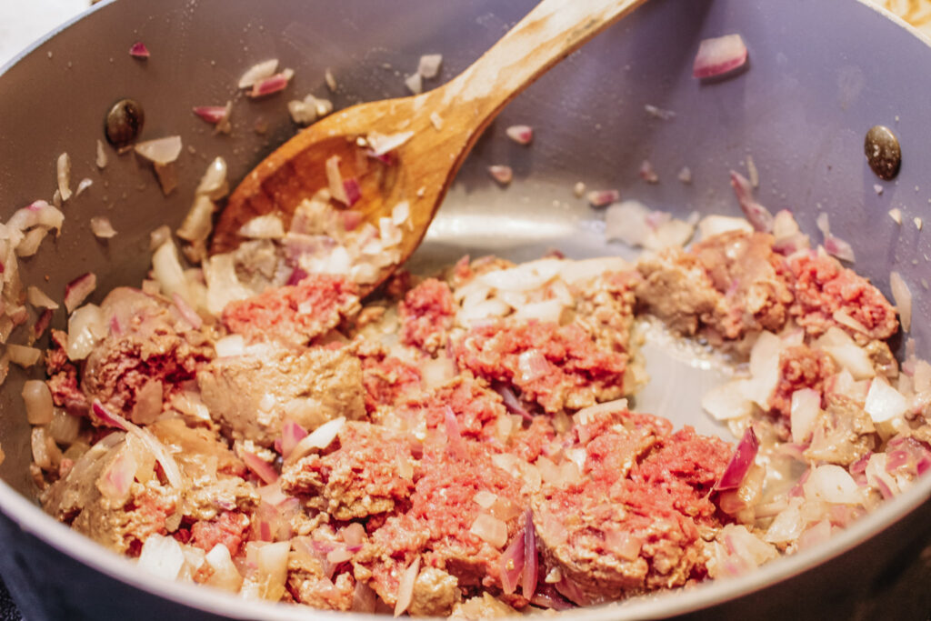 - Once the onions have softened, add the ground beef and begin to cook and incorporate.