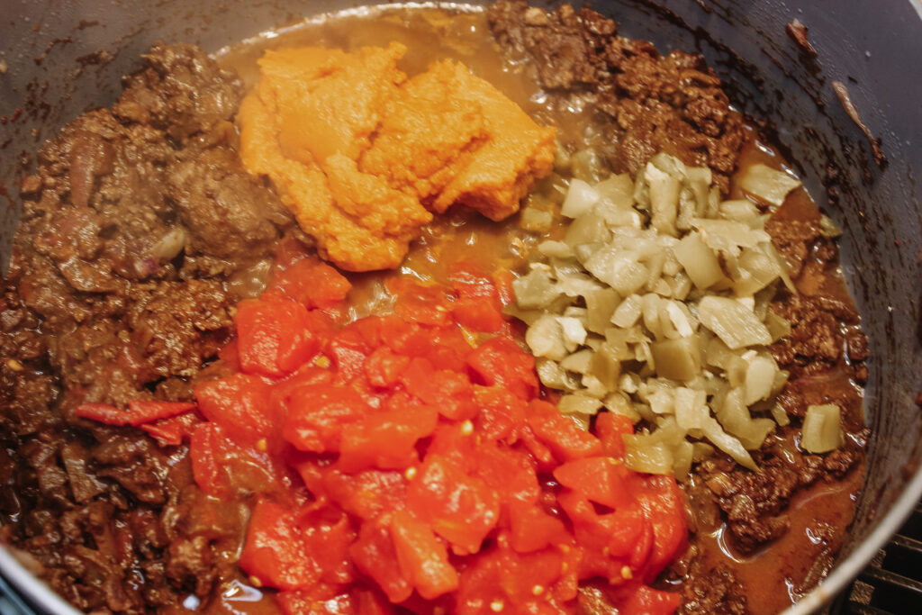 When the ground beef is fully cooked, add in the tomatoes (undrained), green chilies, and pumpkin. Stir and simmer for at least 45 minutes.