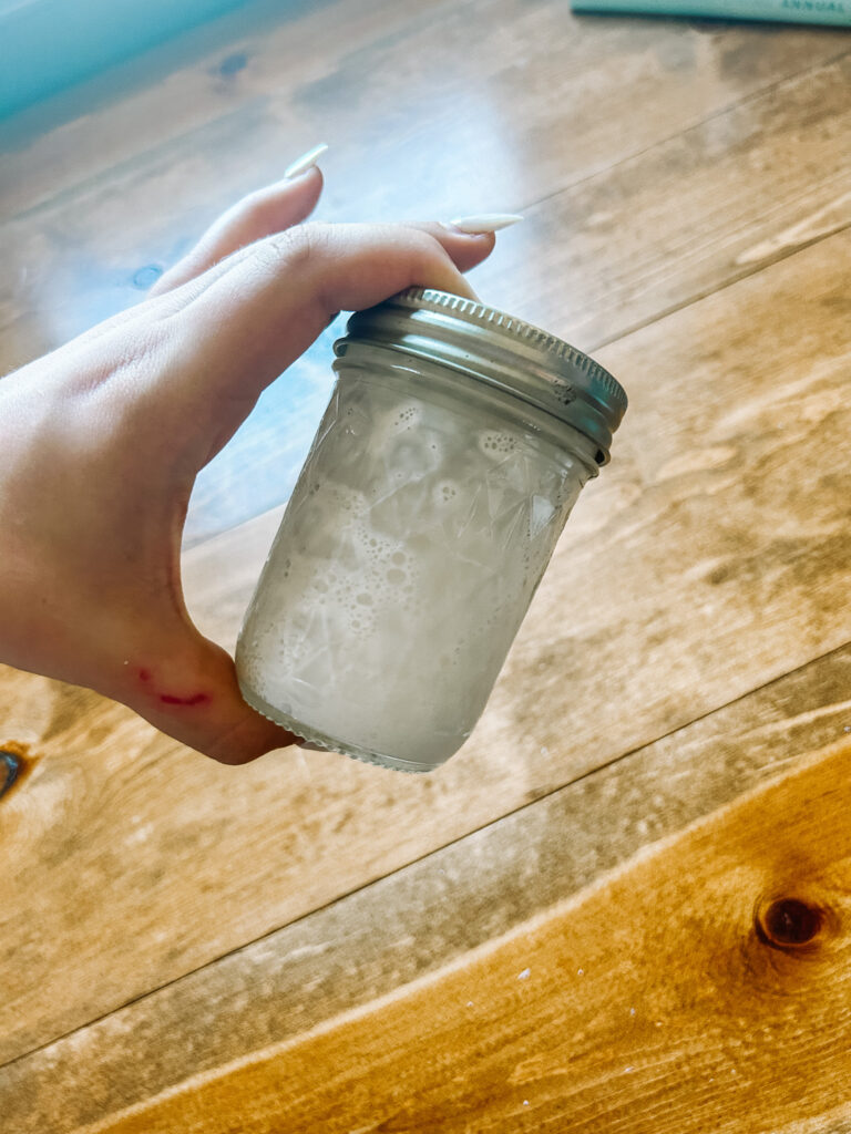 Pour 1/2 cup of WHOLE milk into a quart mason jar. You can use a smaller jar for less milk or a larger for more.